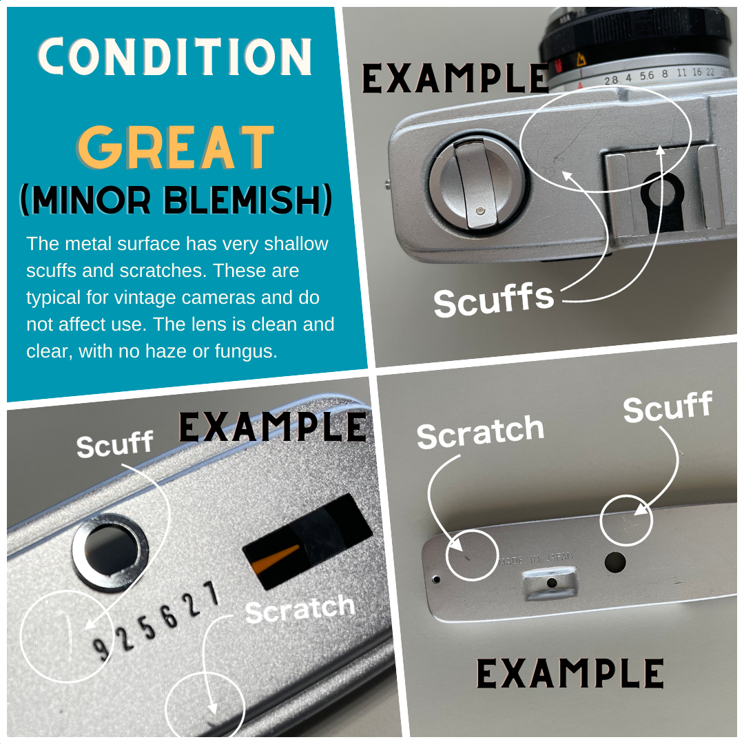 Being nearly 50 years old, the Olympus Trip 35 typically shows some signs of use, but each camera is carefully selected and refurbished. We categorize them into two conditions based on appearance.